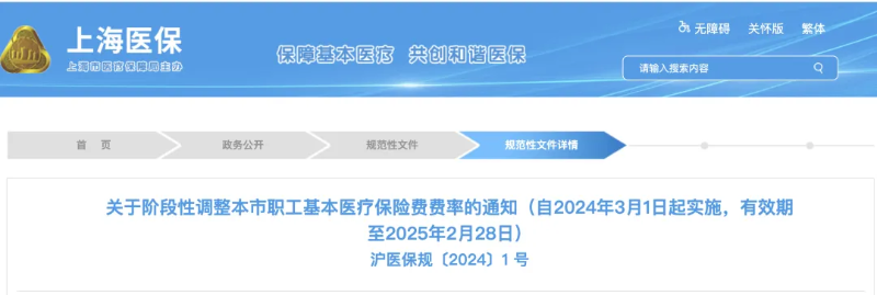 3月29日,上海市医疗保障局发布了《关于阶段性调整本市职工基本医疗保险费费率的通知》,该《通知》自2024年3月1日起实施,有效期至2025年2月28日。